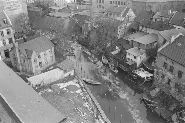 Toppen til venstre paa bilde ser vi "plattingen" som Oslo Veivesen brukte til aa tippe sne i Akerselva.Hest og kjerre ble rygget inn og kjerra ble toemt.