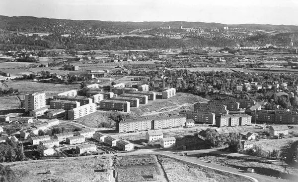 Refstadveien, Brobekkveien, Martin Borrebekkens vei, Krokliveien, Økernveien. Gården til høyre i nedre bildekant er Økernbråten i Økernveien. Blokkbebyggelsen bak til venstre er Økernbråten I med Brobekk senter ved høyblokka. Til høyre Økernbråten II, som senere har skiftet navn til Bjerkedalen borettslag. Risløkka nærmest i bakgrunnen. Utsyn mot Ulvenområdet. Bildetittel er noe misvisende, da dagens betegnelser på dette området er Brobekk og Risløkka. (Flyfoto)