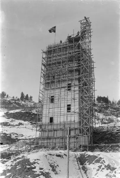 Wallenberg sjakt var i drift fram til 1982. Bildet viser byggingen av det 28 meter høye sjakttårnet i betong.