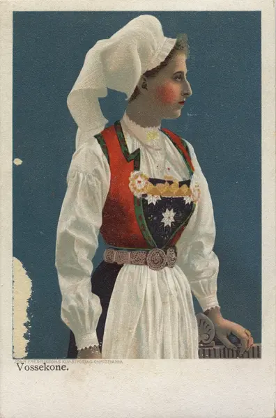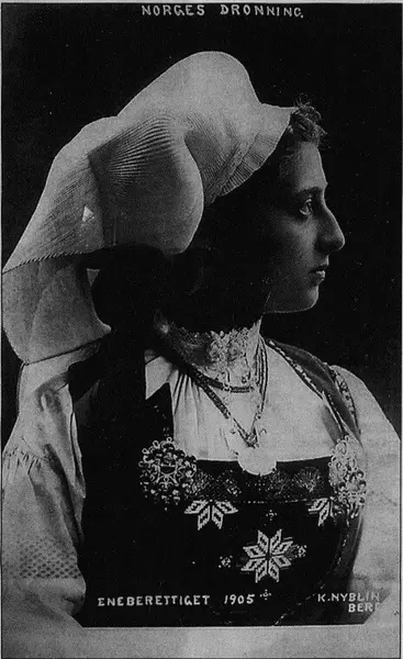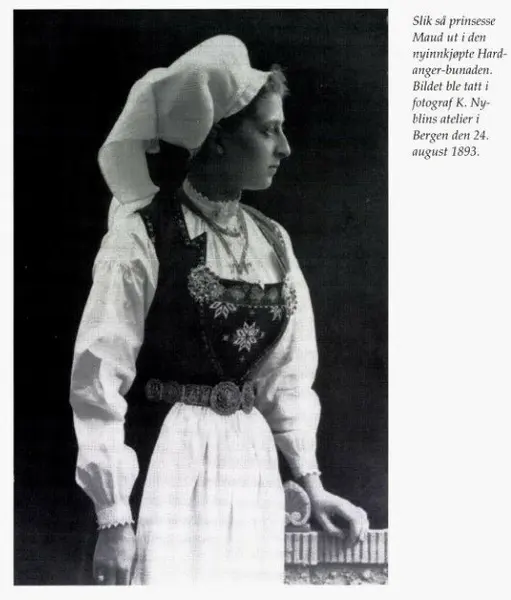 I samband med postkortutstilling ved Odda bibliotek, tidlig 2000-talet, ga utstillaren 6 postkort til biblioteket som takk for lån av lokale. Odda bibliotek ga desse postkorta til Kraftmuseet som gåve. På kortet står "Vossakone", men foto er heilt likt eit bilete av dronning Maud, som er trykt i boka "Dronning Maud, eit portrett" av Arvid Møller. Dette biletet av Maud blei teke i 1893, tre år før ho gifte seg med prins Carl (Haakon). Det er kjend at Maud var i Odda som engelsk prinsesse saman med mor og systre, og at prinsessene kjøpte kvar sin hardangerbunad då. Eit av bileta som blei tekne den dagen heng på Ullensvang Hotel på Lofthus. Vi veit at dronninga også fekk ei Hardangerbunad i gåve av Ungdomslaget og kvinnene i Odda, då dei vitja Odda i 1906. Den bunaden var laga av Anna Jordal på Skjelmhaug.