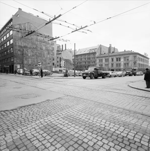- Til venstre for rivningstomten er Dronningens gate 10-12. Til høyre Rådhusgata 1-3 på hjørnet av Skippergata. Gården i midten er Skipperegata 8-10, som tidligere hadde adresse Fred. Olsens gate 1 (gjennomgående gård fra parallellgaten Fred. Olsens gate).