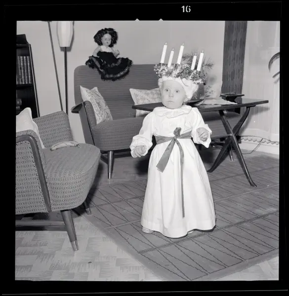 Flickan på bilden är jag. Vi tillfället var jag 16 månader gammal. Har ett blåmärke på min högra kind efter att jag ramlat utför en stentrappa mär jag lussade hos min farmor i Färgelanda. Detta foto var med i Bohusläningen 1959. En bild på Uddevalla lucia och min bild bredvid.