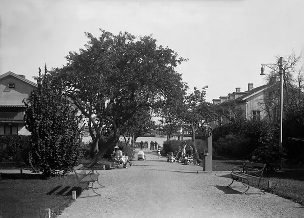 Stadsparken i Marstrand. Vy genom parken mot hamnen.