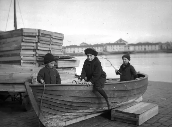 - Tre pojkar leker i en roddsnipa på kajen i Marstrand.