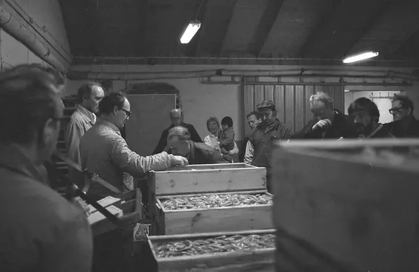Smögens auktionshall med auktion på räklådor.