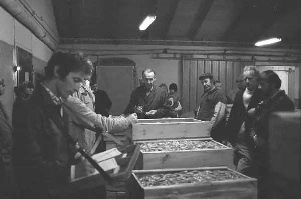 Smögens auktionshall med auktion på räklådor.
