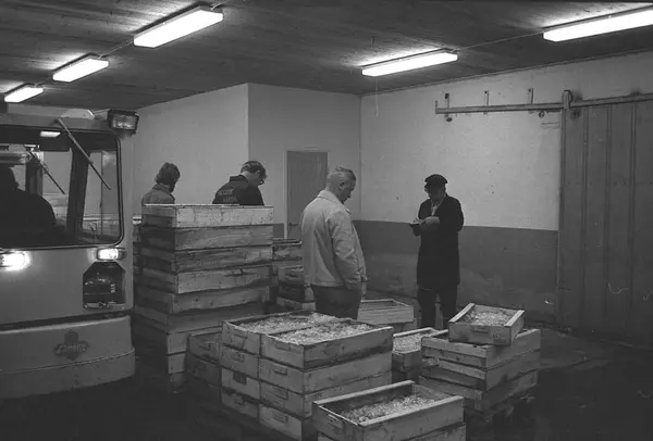 Smögens auktionshall med auktion på räklådor.