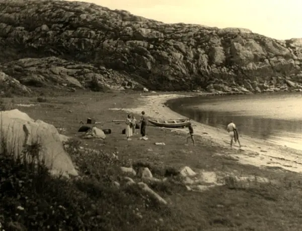 En grupp med vuxna och barn befinner sig på stranden i Slävik. En eka ligger uppdragen på stranden.
