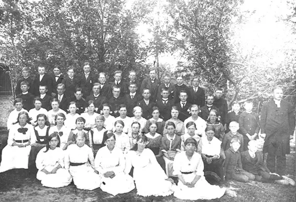 Jag tror att detta är ett konfirmationskort taget 1918. På 2:a raden, 8:e från vänster sitter min farmor Ruth Olsson, (gift Börjesson) från Dvärred 3:20 f.1903 d.2004