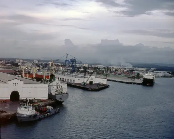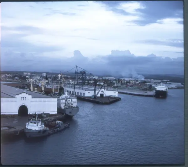 Övrigt: Hamnen i Cristóbal på Panamas östkust. Bilden tagen under Markefelts färd med Transoceans BOOGABILLA genom Panamakanalen 1985. Bogserbåten t v i förgrunden bär namnet O-MAR I men har inte kunnat identifieras närmare; lastfartyget vars akter ses bakom hamnmagasinet är grekiskt men har heller inte kunnat identifieras. Jfr KSSS-samlingens Fo192367DIA och -368DIA.