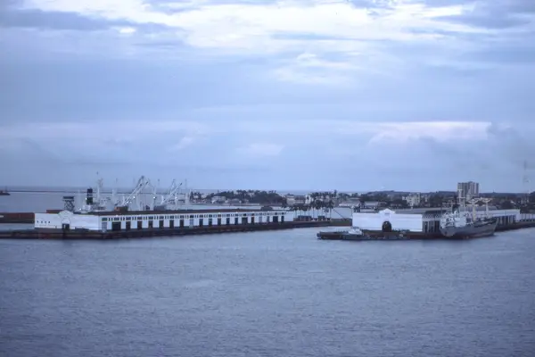 Övrigt: Hamnen i Cristóbal på Panamas östkust. Bilden tagen under Markefelts färd med Transoceans BOOGABILLA genom Panamakanalen 1985. Bogserbåten nedanför hamnmagasinet t h bär namnet O-MAR I men har inte kunnat identifieras närmare; lastfartyget t h om magasinet är grekiskt men har heller inte kunnat identifieras.