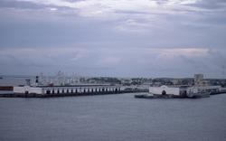 Övrigt: Hamnen i Cristóbal på Panamas östkust. Bilden tagen under Markefelts färd med Transoceans BOOGABILLA genom Panamakanalen 1985. Bogserbåten nedanför hamnmagasinet t h bär n...