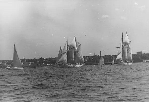 Övrigt: Marinens skolfartyg GLADAN och FALKEN deltog i Gotland Runt-seglingarna 1952 och 1955. Det är inte belagt men tänkbart att bilden tagits vid något av dessa tillfällen. Ovan har GLADAN angivits som bildens huvudmotiv, men vilket av fartygen i h bildfält som är GLADAN och vilket som är FALKEN har inte gått att avgöra. Fo157693 i KSSS-samlingen är gjort från samma neg men riktat och snävare beskuret. Jfr även Fo134961 och Fo157692 i KSSS-samlingen, som förefaller vara från samma tillfälle.