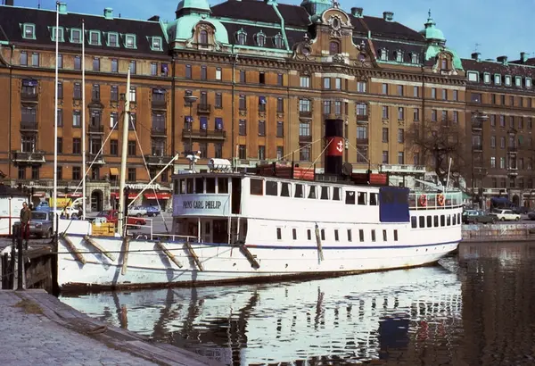 Övrigt: Strömma Kanalbolagets PRINS CARL PHILIP i Nybroviken, April 1983. Fotografi före ombyggnationen av övre däck med "trappstegssnickerier".