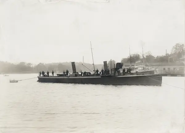 Övrigt: I fotobeskrivningen uppges denna bild visa torpedbåten ORION vid Bergsunds Mekaniska Verkstad 1903. I bakgrunden ses passagerarångfartyget SÖDERN (b. 1882 på Motala Warf i Norrköping, reg nr 1494). Bilden skänktes till SSHM 1936.