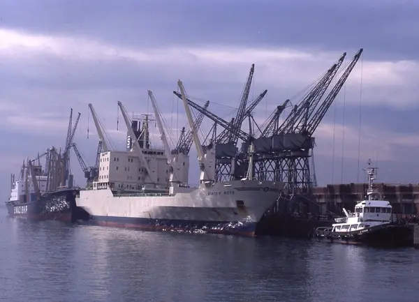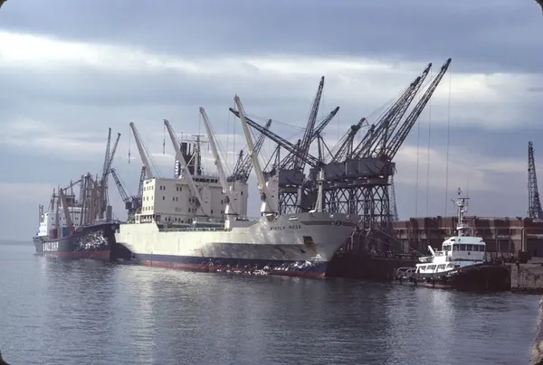 Övrigt: WINTER MOON i Port Elizabeth, Sydafrika, 1979. Framför WINTER MOON t h ses bogserbåten P. J. CONRADE (ex ONYATI, b. 1977, IMO 7603215); t v ses SWAZI TRADER (ex HANNOVERLAND, b. 1966, IMO 6610015). Markefelt har i anteckningar förvarade i anknytning till samlingen omtalat att han i slutet av mars 1979 åkt från Oslo med Transatlantics ELGAREN och via olika hamnar kommit till Kapstaden. I Sydafrika tillbringade han någon tid med att fotografera i Kapstaden och på olika plantager, innan han i Port Elizabeth gick ombord på WINTER MOON för att anträda återfärden till Europa; han lämnade WINTER MOON 20 maj. Shipping & Shopping