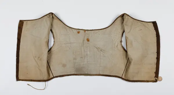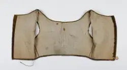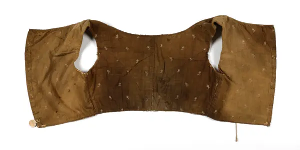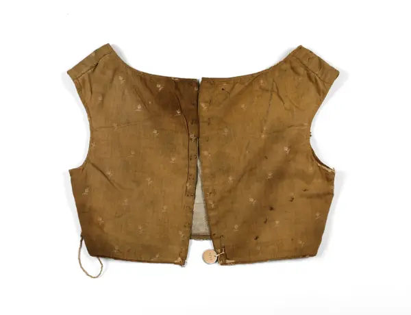 about Kjoleliv som er fôret og hektes sammen i ryggen. Fôret er av lin og ellers er livet av bomull. Det er lagt inn snor i folden i nedkant og i front (passe poilerte kanter). Skjørtet har vært festet i livet, men er sprettet av. Livet har hatt 11 hekter, som nå er fjernet, og trådrester sitter igjen etter disse.