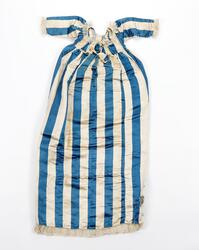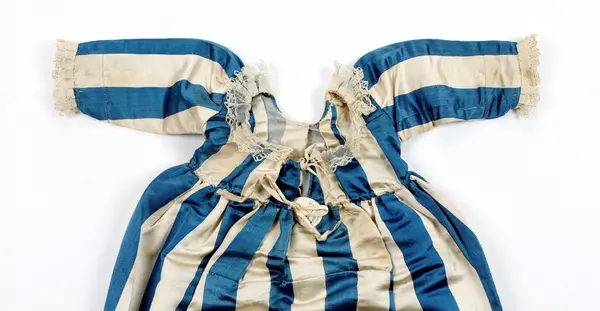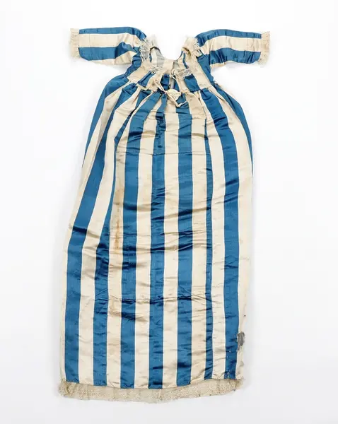 Stoffet i såkalt Pekingstriper var veldig populært i motebildet på slutten av 1700-tallet. Dåpskjole båret i begynnelsen av 1800-årene. Mulig omsydd brudekjole.Skrevet av Karen Syversætre på DIMU: