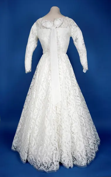 Lang trangt erme, dyp utrigning med 2 rossetter bak. Trangt liv, lang glidelås bak. 3 lag underskjørt stivet tarlatan. 1 lag silkelook . 1 lag tyll(?)