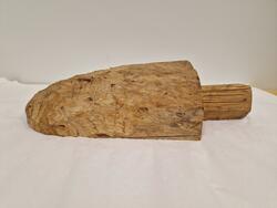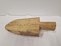 - Auskaret er et emne som lå klart i naustet til å ferdiggjøres i påkommende tilfelle. Jon Godal skriver: "Det er praktisk å sage ut for handtaket, og så formar vi karet med breiøksa på stabben. Dersom vi får til ein kvist akkurat framimot spissen der det er mest tverrved og karet er tynnast, vil dette binde og styrke." Auskaremnet kommer fra Harbak, Åfjord.