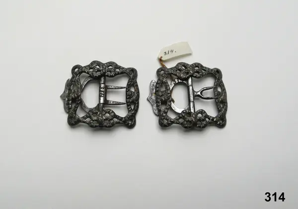 "314a-b Silfverspännen. Knäspännen. Tillh. lärftskramhandlaren Johan Hazelius. G. ss. 50 [=af fröken Louise Hazelius] under hösten 1872."