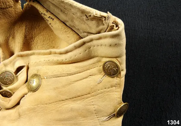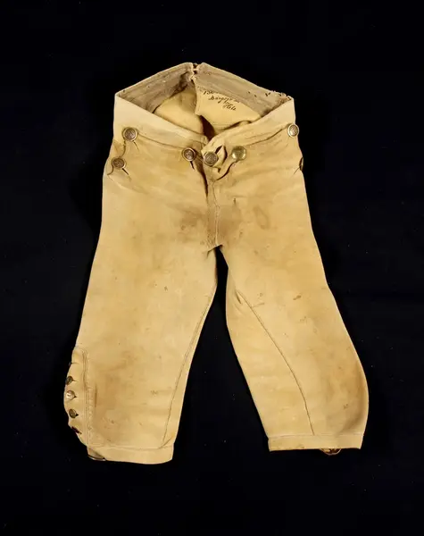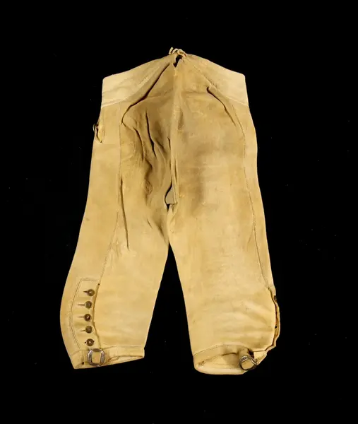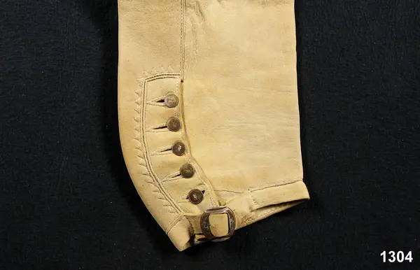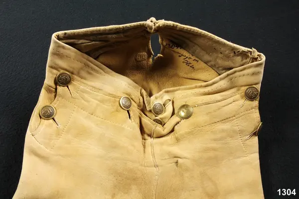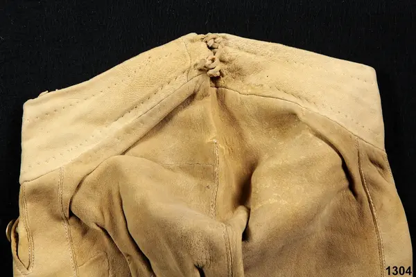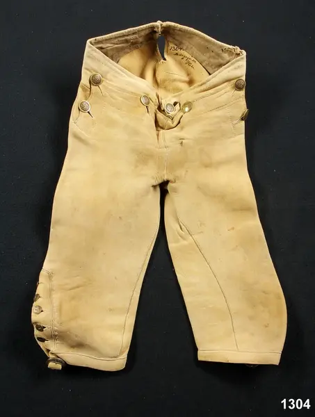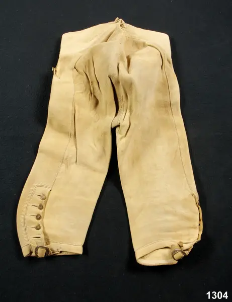 "1304 Ett par älgskinsbyxor fr. Bärgsjö sn. Norra Helsinglands fgd. Helsingland. Från 1700-talet. Tillh. ss. 1303 [=mansdrägt i Bärgsjö]. Ink. ss. 1303 [=gm. skolläraren i Bärgsjö Erik Högström på Elfvik. Ank. 23/5 1873] = 10 rdr. Bil. Högström 2."