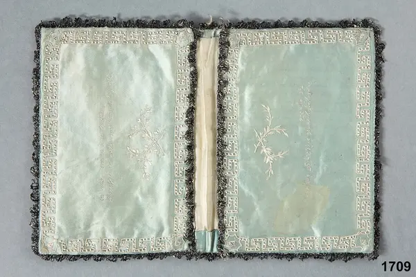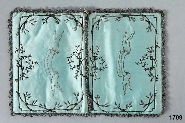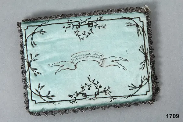 "1709 Broderad sidenplånbok. Med broderade in skrifter på fyra språk (grekiska, latin, franska, engelska) - 'a penny saved is a penny got' - . Tillh. biskop F. M. Franzén. G. af enkefru H. Grafström, f. Franzén, i Stockholm 17/6 1873."