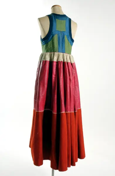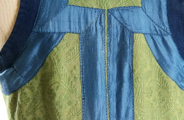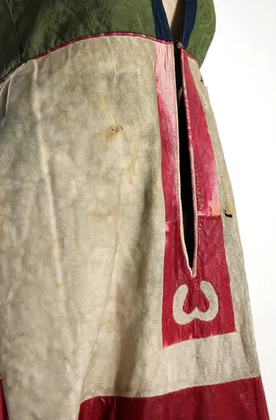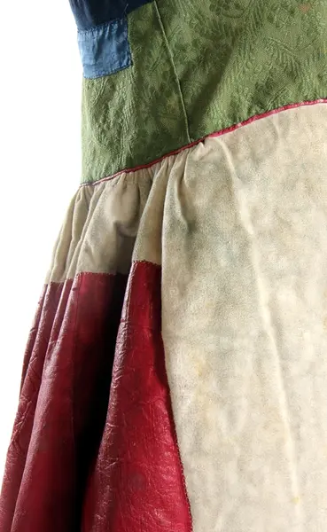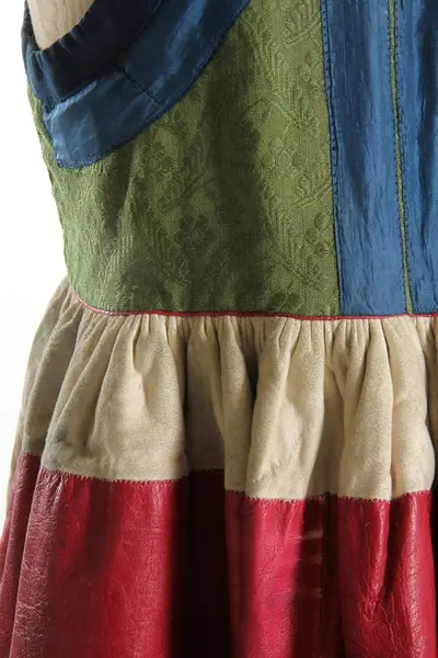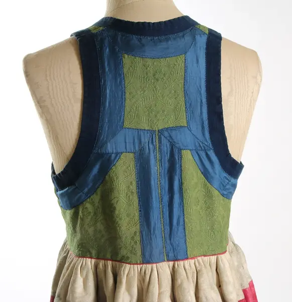 "3458 Päls fr. Järrestads hd; Skåne. Se 3455, uppgifter rörande kvinnodräkten m.m. [= 3455 till och med 3470 hör till kvinnodräkten. 'Någon annan högtidsdrägt brukades ej inom Jerrestad. Bruddrägten var i det närmaste öfverrensstämmande med denna, utom att då en särskild hårklädsel - en mängd i håret inflätade band - begagnades'] Pälsen brukades vid högtidliga tillfällen (bröllop, barndop) under det gröna skörtet, men på Söndagar ss. ytterplagg. Den skarfvade framsidan doldes då af det blåa förklädet. Se 3459. Ink. ss. 3455 = 8 rdr. [= Ink. gm fru Maria Ribbing, f. De Vylder, i Simrishamn, hösten 1873.] Bil. Ribbing 4a."