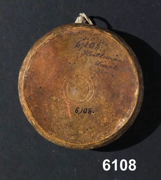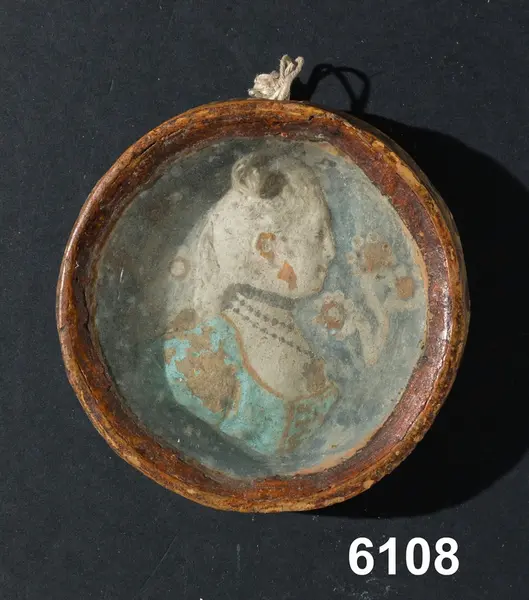 "6108 Medaljong fr. Hvetlanda sn. Porträttmedaljong. Af lergods. Lik föregående, men bilden framställer en kvinna i djupt urringad grön klädning. På båda sidor af bilden en målad tregrenad kvist med en ros i rödt och hvitt på hvarje gren. Troligen Gustaf III:s gemål Sofia Magdalena. Ink. ss. 6.107. Bil. Vistrand 9."