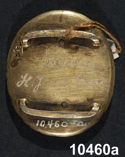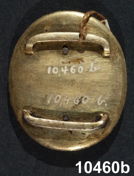 "Miniatyrporträtt, ett par spännen. Två ovala miniatyrmålningar, infattade i ramar af mässing under glas med facetttslipad kant; baksidorna af mässing med tvänne byglar för band å hvardera.
