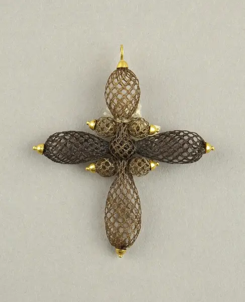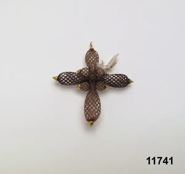"Kors af hår. [föremålet består av endast en del. Litteran berättar bara vilkas hår som ingår i smycket. På katalogkortet visar litteran vems hår som använts till vilka delar av smycket]