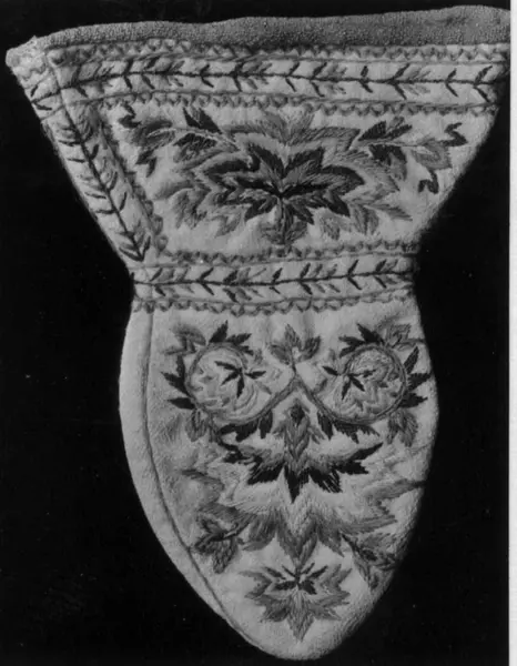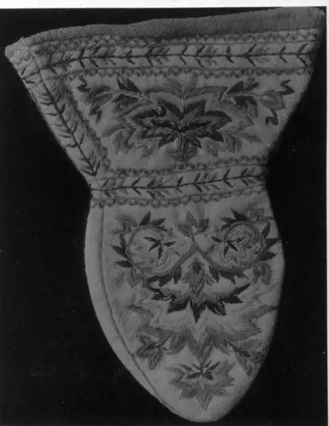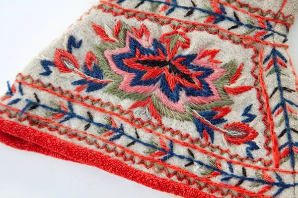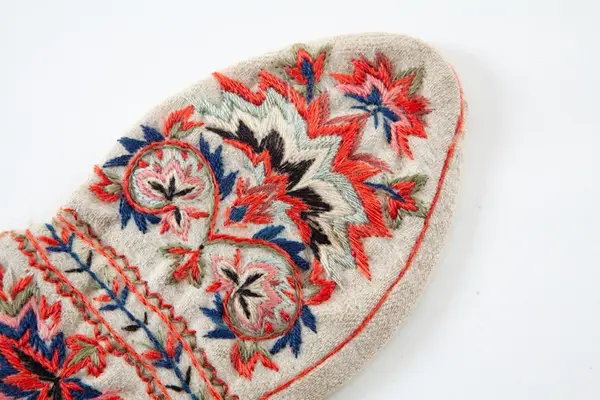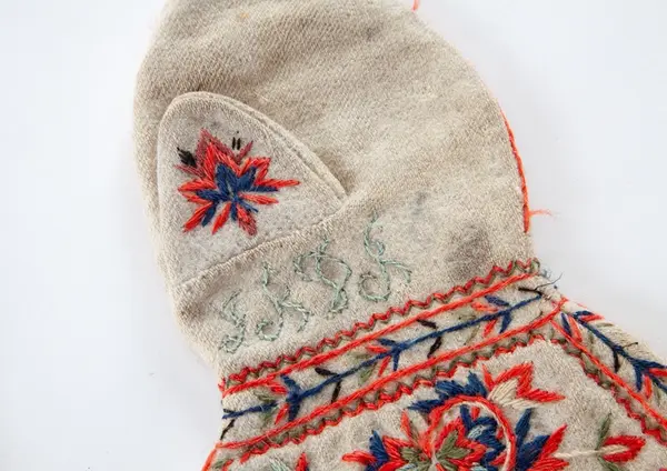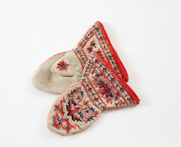 Et par. Hvitt kypertvevd ullstoff med ulltråd. Stoffet 3 skaftet diagonalveving. Kant på mansjett rød vadmel, brodert på håndbak, mansjett og tommelfinger i plattsøm, kontursting og attersting i 3 røde farger, 2 blå, grønt, hvitt og svart. Brodert kant av kontursting langs sømmen av votten.