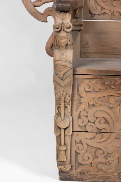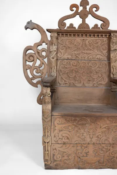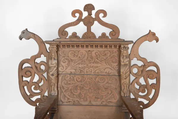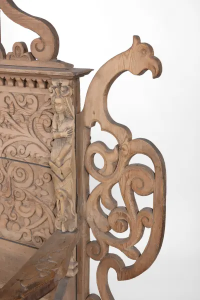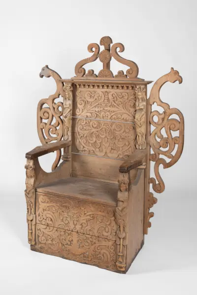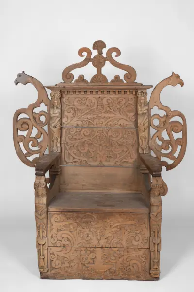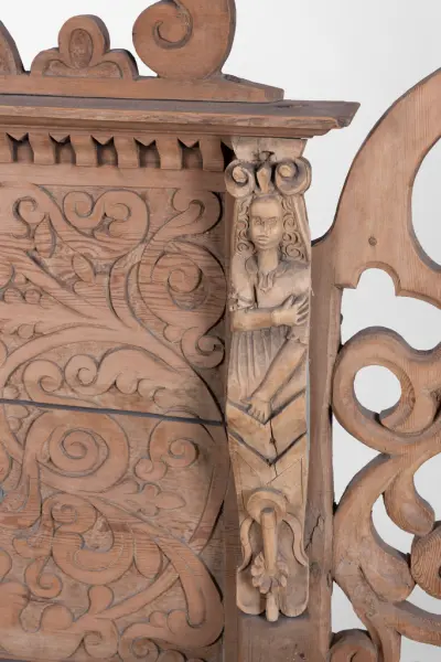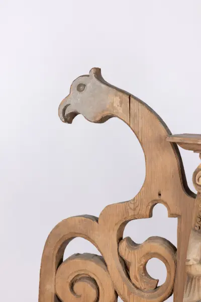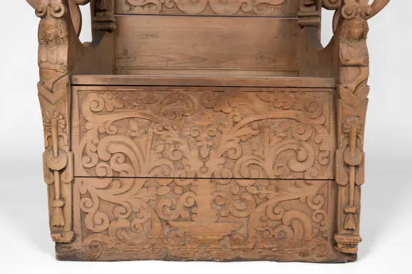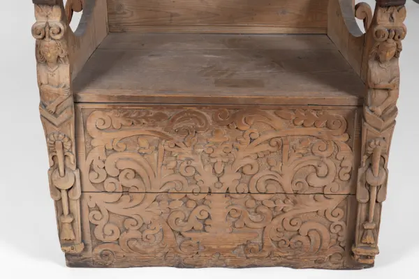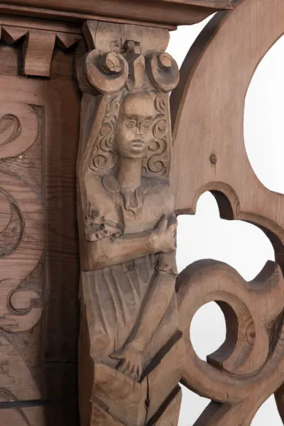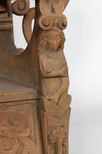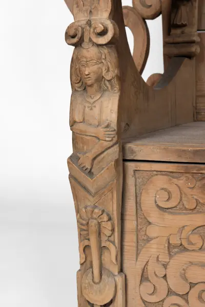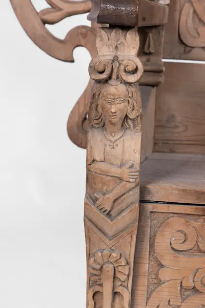 - Stoler hadde ulike bruksområder i kirken, for eksempel ved skriftemål eller som sitteplasser i sakristiet og i private losjer. Denne stolen er utsmykket med flatskurd - flate mønstre av blader og ranker med lavt relieff er et kjennetegn ved den norske renessansestilen.