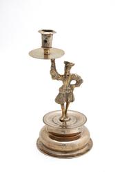 Flamsk? Messing. På figurens hode gravert: B?SS. På platen gravert: A E S D. Stempel på fotplaten: S S med en saks imellom. Foten støpt og dreiet, figuren støpt og siselert. Foten har visstnok opprinnelig hatt skaft dreiet i profil som f. eks. NF. 1915-1142. Lyspipen synes å ha tilhørt denne. Foten som er av lys messinglegering bærer drakt fra midten av 1500-årene og har visstnok hørt til en alterstake. Lysmansjetter synes i følge sin gravering å skrive seg fra 1700-årene, formodentlig samtidig med sammenslutningen. Fotens profil og stempel det samme som NF. 1902-142, NF.1915-1142, NF.1906-498 og NF. 1904-381. Tidligere nr. 1515.