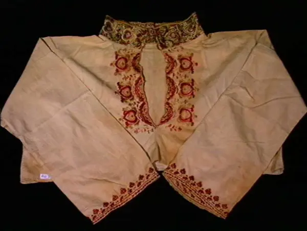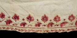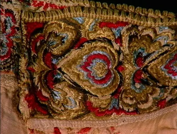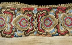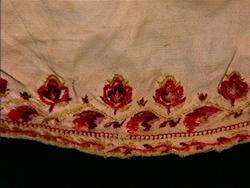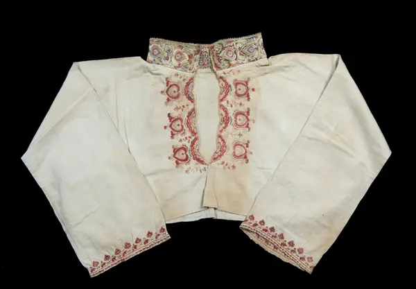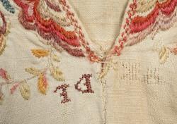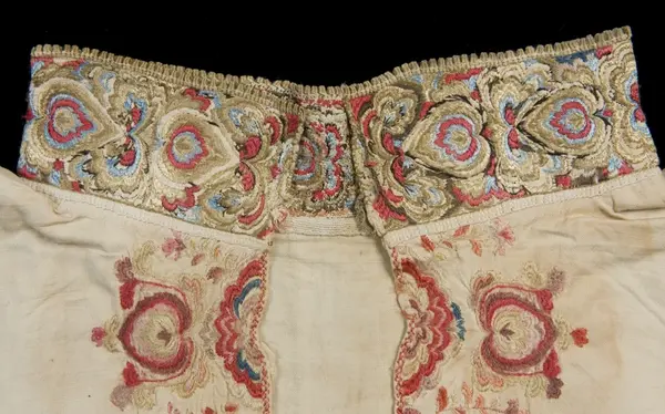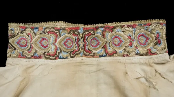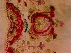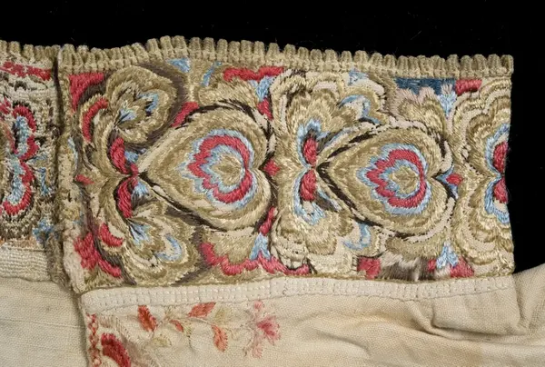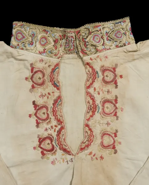 "Gammel, lidt fillet og lappet Brudeoverdel med Uld- og SilkebroderiPaa Krave og Bryststykke"