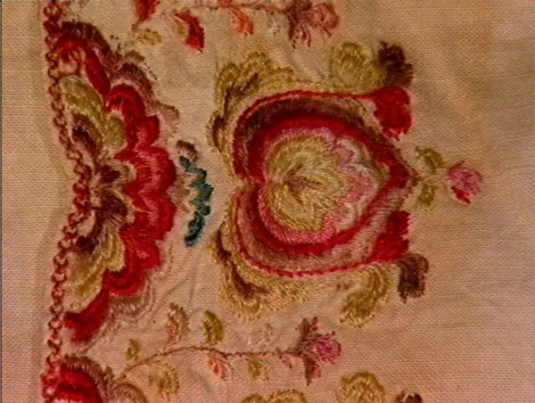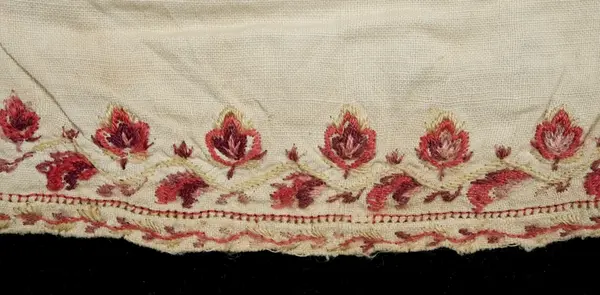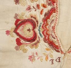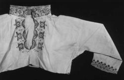 Overdel, bomullslerret, brodert med ull og silke i flere farger. Mrk: VKDL. Håndsydd. Ikke skuldersømmer, brystsplitt, oppstående halslinning. Isydde ermer uten linning. Høyre erme sydd av 1 stykke med søm på,undersiden, venstre av 2 stykker. 4-kantet ermspjell. Ryggen skjøtt nedentil med 1 stykke løsrevet linlerret, dette er lappet på ene siden med 1 stykke bmullslerret. Også lappet med ditto ved halslinningen med ditto belegg. Halslinning av linlerret med ditto belegg. Brodert med ull og silke, flammesaum, plattsøm i gulhvitt, beige, mørkebrunt, rosa (kald sinober), karmin og lyseblått. Mønster av hjerteformete blad. Langs overkanten kvalesaum i beige, ditto taggekant. På ene kortsiden rester av korssting i beige, på andre rester av knapphulls-sting i samme farge. Rester av hemper i beige. Nederst på linningen 2 rader attersting av hvit lin. Kastet til overdelen. Brodert langs brystsplitten med flammesaum, plattsøm og kontursting. Mønster av hjerteformete blad og en slags palmetter. Langs kanten av splitten attersting med slyng. Farger: rosa (kald sinober), oransje, kromgult, karmin, lyserødt, gulhvitt, gråfiolett og litt sterkt lyseblått. Nedenfor splitten mrk: VKDL, i korssting. Langs ermåpningen brodert med plattsøm, kontursting og 1 rad kvalesaum. Farger; gulhvitt, rosa (kald sinober), karmin og gråsrosa. Tidligerer museumsnr. 313.