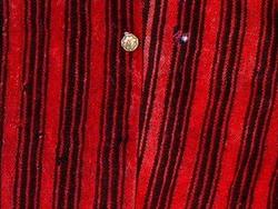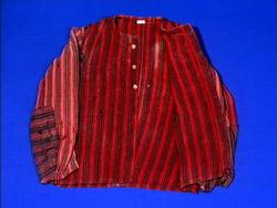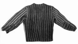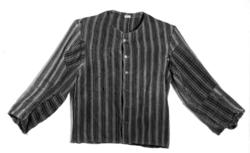 Ullstoff, rød- og svartstripet. Maskinsydd. Heimevevet ullstoff i kypertbinding. Åpen foran. En 4 cm. bred skoning av stoffet langs åpningen. Seks knapphull på den ene siden av åpningen og tre metallknapper på den andre. En 1,5 cm. bred fald på nedrekanten. Ermene er lappet. Tilstand: Møllspist.
