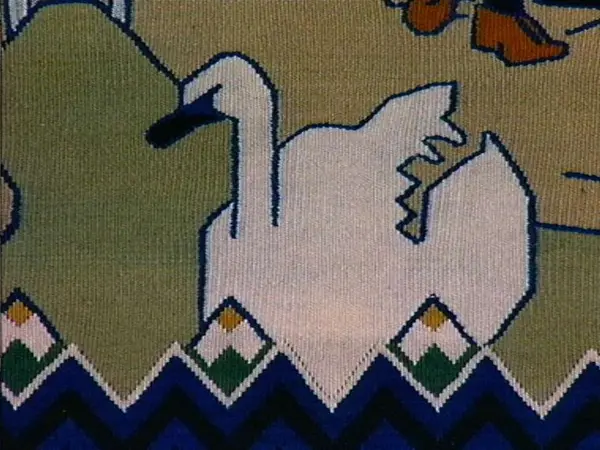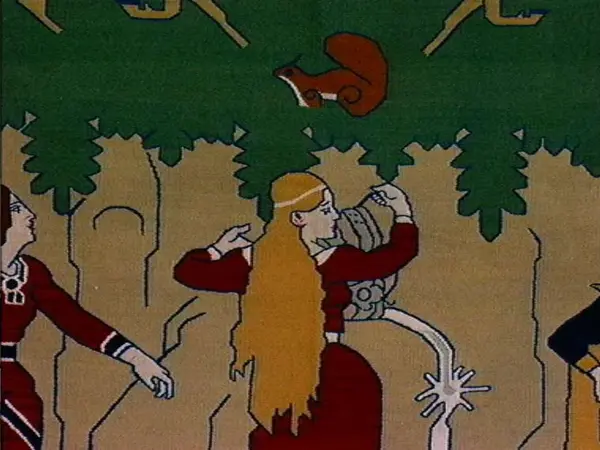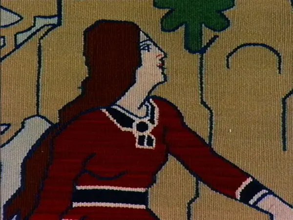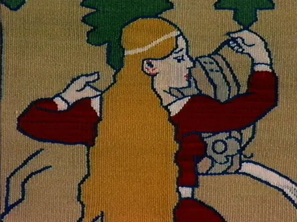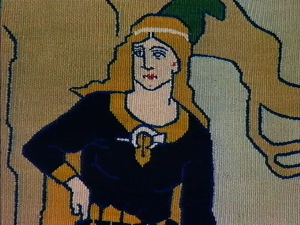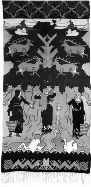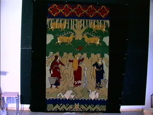 De tre nordiske land framstilt som kvinnene Nora, Dana og Svea. Ull og bomull. Merket: E. BLOCH 97 Tilstand: Noen ørsmå hull, men stort sett meget bra. R: Nitrådet bomullsgarn, 4 tr. pr. cm. I: Totrådet ullgarn, ca. 21-24 innslag pr. cm. Farger: R: Hvitbeige. I: Røde, gule, grønne, brune, blå og beige farger, samt hvitt. Oppl: Utført av frk. Elise Bloch (f. 1858, d. 1939) i 1897, etter kartong av hennes bror, maleren og tegneren Andreas Bloch. Elise Bloch var utdannet hos Frida Hansen. Motivet er de tre nordiske land, framstilt i form av tre kvinneskikkelser, Nora, Dana og Svea. Teppet var utstilt og prisbelønnet på Allmanna Konst- och Industriutstallningen i Stochholm 1897 (sølvmedalje), samt på tilsvarende utstilling i Bergen 1898 (bronsemedalje).