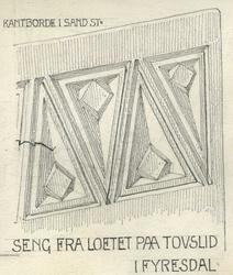 - LitteraturreferanseMeyer, Johan: Fortids kunst i Norges bygder. Telemarken 5: Mo, Fyresdal, Vraadal, Nissedal og Nordre Tørdal. Christiania 1918. Pl. VII.