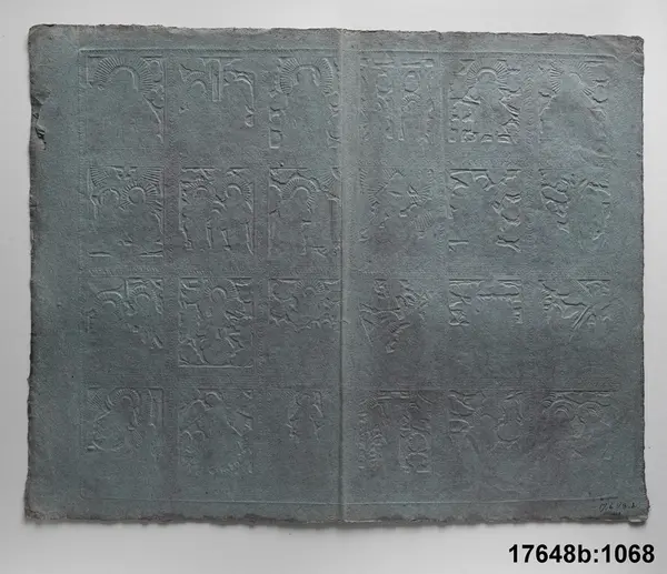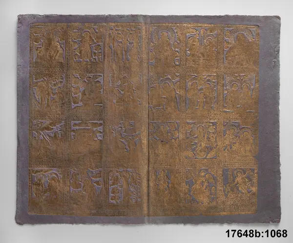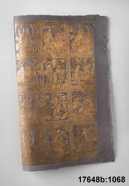 B.1068 Pappersark, dubbelvikt, 45 x 35,5 cm; prov på dekorationspapper med guldpressat mönster på lilafärgad botten föreställande 24 scener ur gamla testamentet och Jesu liv, sign: =MICHAEL REYMUND IN NURNBERG'."