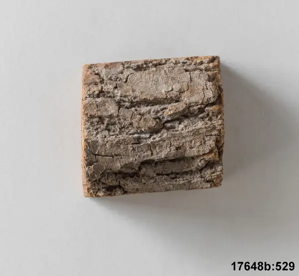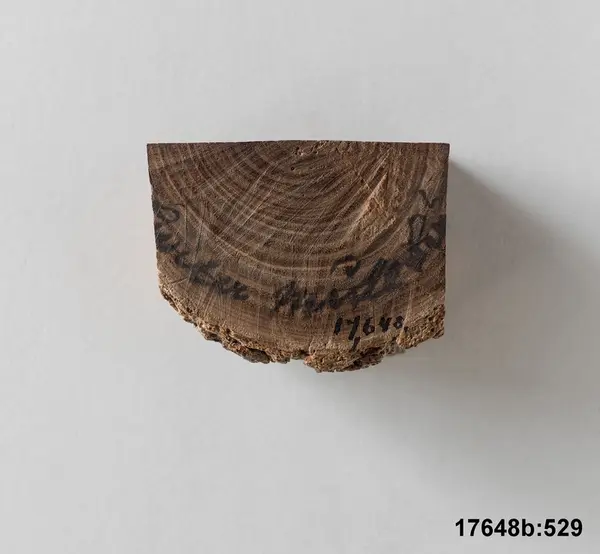 B.529 Träprov, avsågat stycke av stam el. gren, segment, med påskrift m. bläck:'Hwita Mullbär'"
