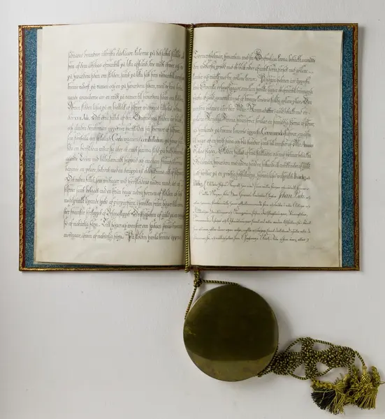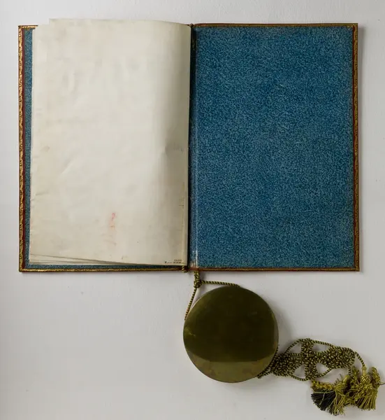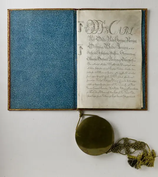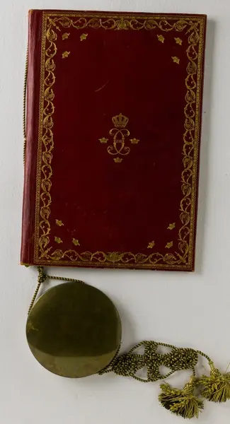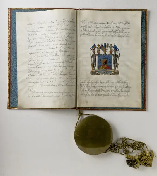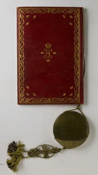 "Pärm till grevebrev. Rött skinn med guldpressning. 1814. Stockholm, F.W. Statlander [med blyerts]. Grevebrev för Johan af Puke utf. av Carl XIII dat. 31.8.1814. Å pärmarna konungens namnchiffer. Sigill m. blågul snodd. G. gm. L. M. Kruse, av grev:an Chr. af Puke, f. Giertta 25/6 1879."