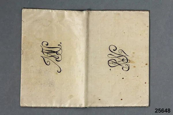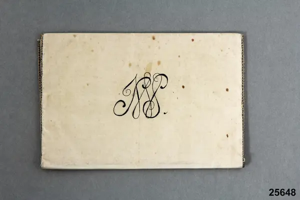 "Plånbok. Af siden, broderad. Märkt: ' Secreteraren Wälädle Herr S.W. Stahre Stockholm.' [monogram] S W.S [monogram] I M F S. G. af fröknarna Augusta och Anna Klemming gm. bibliotekarien J. A. Ahlstrand 17/1 1880."
