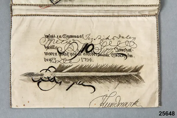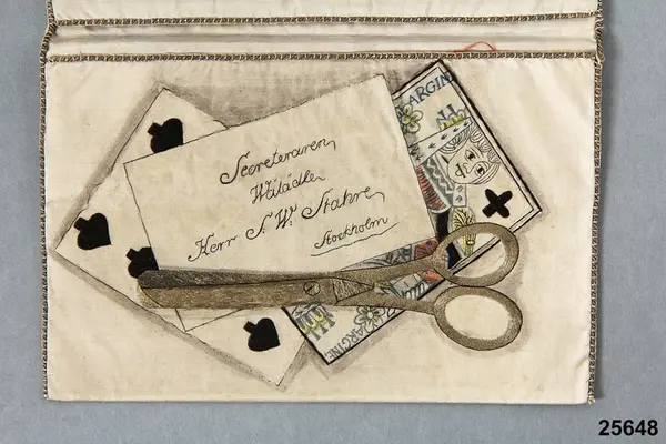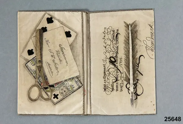 "10 riksdaler specie, Riksgälds, den 23 december 1794, signerad kontorsskrivaren J. Lundmark. Endast den nedre hälften av sedeln är återgiven på den ena hälften av plånbokens insida. På andra sidan ett trompe l'oeil-stilleben föreställande två spelkort, en sax och ett kort å vilket finnes antecknat 'Secreteraren Wälädle Herr S. Stahre, Stockholm'.Detta syftar troligtvid på sekreteraren vid Stockholms Stads Brandförsäkringskontor S.W. Stahre."