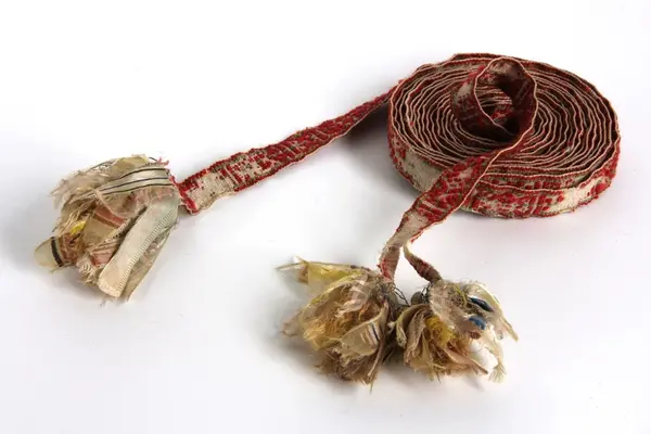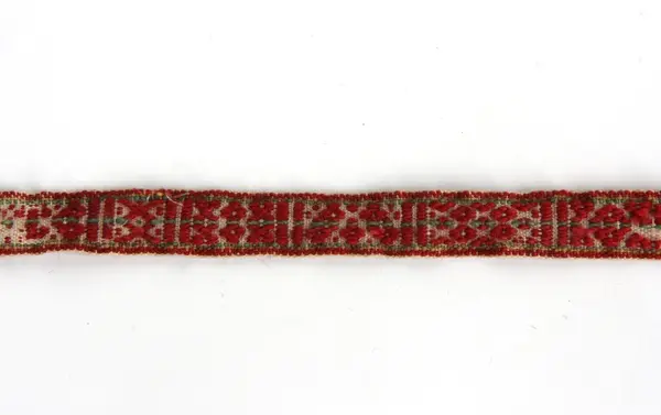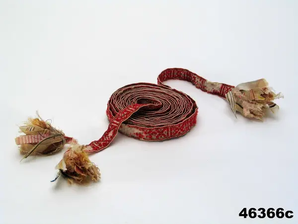 c: Mönstervävt band, 'krusband', med tofsar, 'tuppor', i ändarna. Varp av viitt bomullsgarn och rött ullgarn med grön och gul mitt- och kantbård, inslag av bomullsgarn. Bandet har varierande mönsterformer avdelade med stolpar. I ena änden har varpen delats och avslutats med två styck fyra cm långa tofsar, av tygremsor i bl a siden, den andra änden avslutas med en tofs.