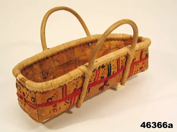 a: Dopkass av flaknäver med handtag. Kassen - korgen - har en långsmal form. Flera lager av näver har vikts och sytts ihop med klyvsöm. På kassens långsida finns en "krage" 6-7 cm bred. Kanten har en vidja lagd på ut och insidan av sidoväggen och gavlarna. Vidjan är fäst med en tät lindning av rottågor, i kanten följer en smal vadmalsremsa. Sidohandtagen består av en bågformad käpp, de är fastsurrade i ändarna och i kassens övre kant. Under klyvsömmen ligger röda och blå vadmalsremsor som förstärkning och dekoration. Kassen är dekorerad med "vadmalsnoppor"och små olikfärgade vadmalsbitar sydda på varandra. Tygbitarna är fastsydda med en lintråd som löper längs kassens insida. .Årtalet 1793 är inristat på ena gaveln.