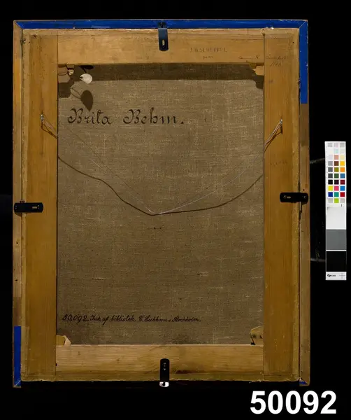 "Behm, Brita. Brb. olja på duk. [Med blyerts senare tillskrivet: Omkr. 1750. J.H. Scheffel]. Spännramen ny, har påskrift J.H. Scheffel pinx. Renov. af K. Brunkal 1883, rentoilleradt. På gamla duken med färg Brita Behm. Brita Behm f. 1670, gift med prof. Joh. Schwede d 1755. Hvitt hår, bruna ögon. Klädningslif af hvitt siden, päls af violett sammet med hermelinsfoder. Svart slöja på håret. Brunt bakgrundsdraperi, grå kolonn, blå luft. Ink. fr bibliotekarien C. Eichhorn i Stockholm25.X.1886." " "Tillstånd: Duken sitter lös från ramen. Sprucken i förgyllningen och skavd. Duken konserverad. PS 1982."