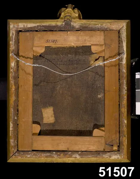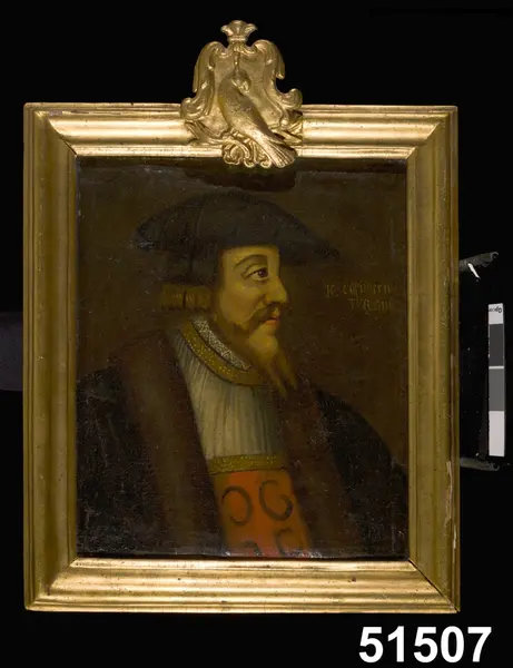 "Tavla, porträtt, Kristian II. duk, olja. HL= 'Porträtt av Kristian II Tyrann, utfördt i olja; märkt K. Christern Tÿrann; bröstbild. Målning från 1600-talet. Bil." Tavla, porträtt i olja på duk spänd på kilram; förgylld ram krönt av kartusch medd fågel; bröstbild i profil föreställande Kristian II Tyrann. Tillstånd lappad med två lappar på baksidan, krakelerad men ej flagnad; ramen något smutsig, fläckig och dessutom stött i h. kanten. I. på konsthandl. H Bukowskis auktion 15/42 1886 och följande dagar, kr 12:- / GÖ 82."