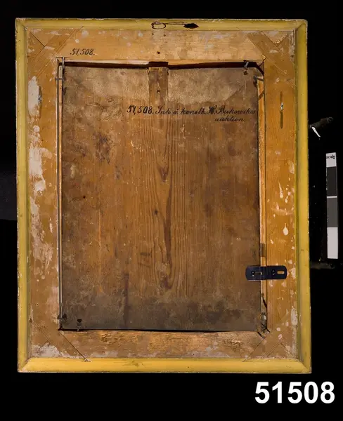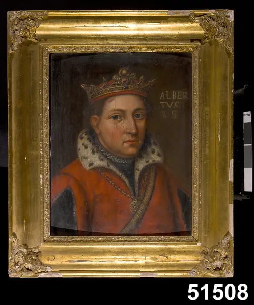 "Tavla. Porträtt av Albrekt av Mecklenburg; i olja på träpannå. Märkt:*ALBERTUS R:S'. Konung i Sverige 1364-1389. Död i Mecklenburg 1412. Enligt HL 'målning från 1600-talet (från Bukowskis tryckta förteckning.)'. I förgylld träram. Tillstånd 1981-11-27: Träpannån är slagen och lös från ramen. Ramförgyllningen har flagnat. Obs! Färglystern är förvånansvärt bra trots åldern. Bil. Je 1887. I. från Bukowskis auktion den 15 dec. 1886 för 12:- / PS 1981."