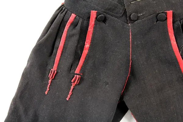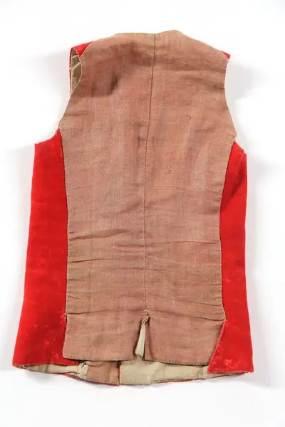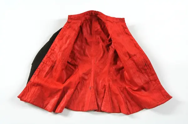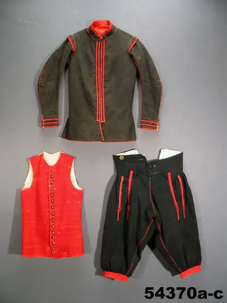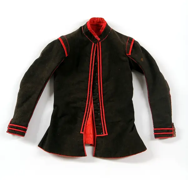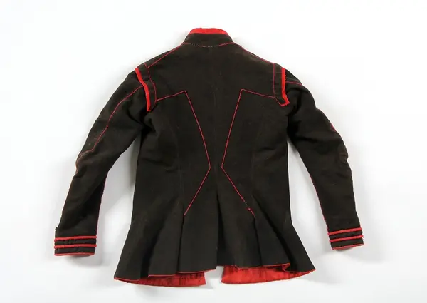 Jacka av brunsvart kläde, längd 58 cm. Kragens höjd 4,5 cm. Sydd med två rygg- och två framstycken, garnerad med röda klädeslister[?] och röda yllesnodder, vilka senare ej markera sömmarnas verkliga läge i ryggen. På ärmarna fem igenstoppade knapphål. Foder av röd rask, i ärm.